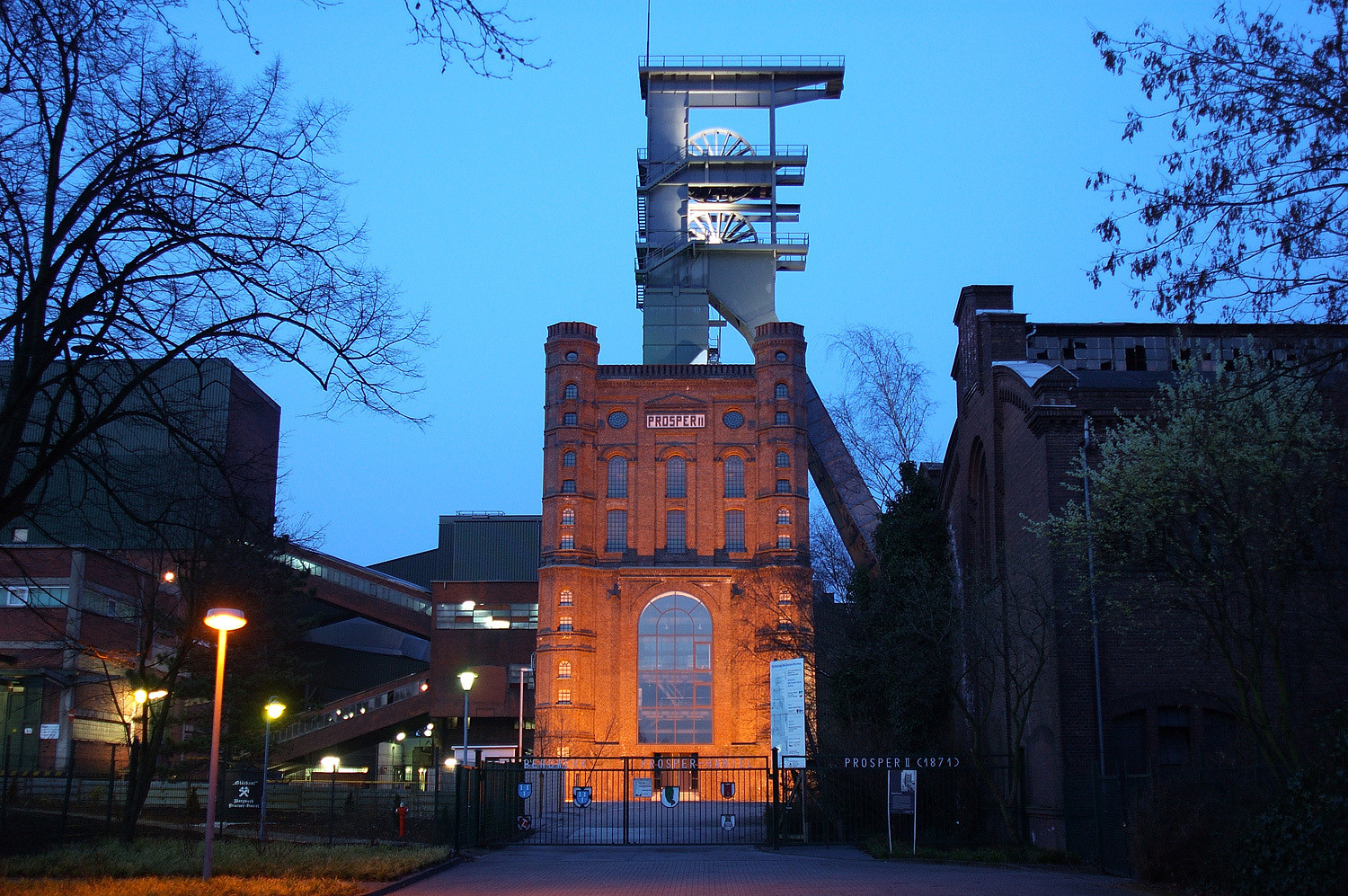 | 4348518862_4aafb7430c_h(1).jpg | Quelle: Stadt Bottrop · Lizenz: CC-BY-SA | 4348518862_4aafb7430c_h(1).jpg: Backsteinbau des Malakoffturms mit beleuchtetem Fördergerüst der Zeche Prosper in der Abenddämmerung |