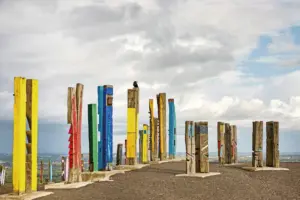 | Waldkompetenzzentrum Heidhof, Bottrop, bemalte Pfähle | Quelle: Kreis Recklinghausen · Lizenz: CC-BY-SA | Waldkompetenzzentrum Heidhof, Bottrop, bemalte Pfähle: Bemalte Holzpfähle mit Naturmotiven stehen auf einem gepflasterten Platz im grünen Waldgebiet. |