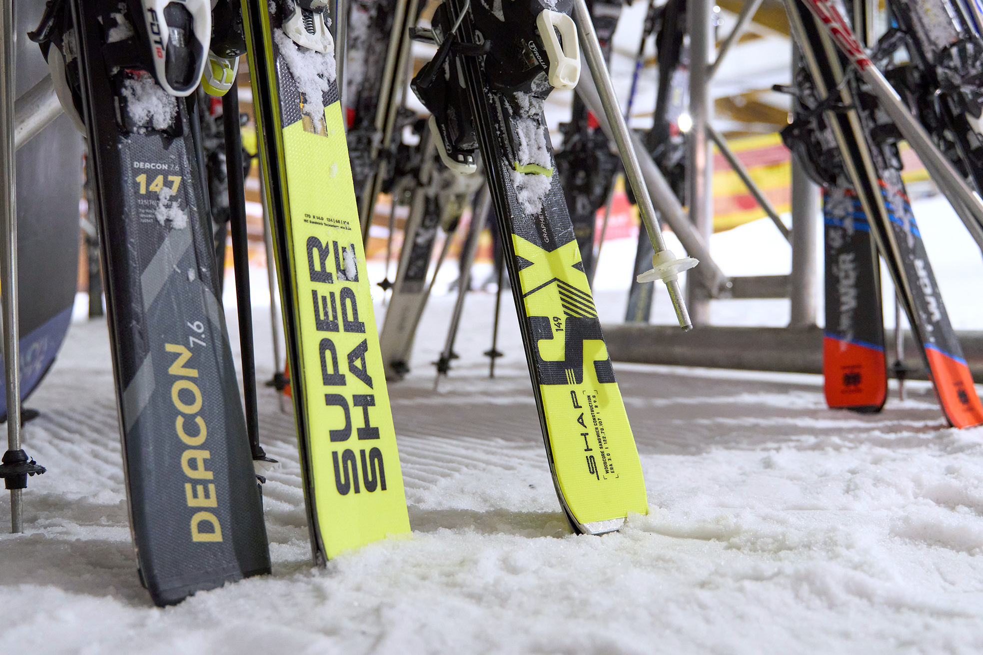 | Alpincenter, Bottrop | Quelle: OLFF APPOLDwww.olffappold.com, Ruhr Tourismus GmbH · Lizenz: CC-BY-SA | Alpincenter, Bottrop: <p>In einem Skiständer stecken mehrere farbig markierte Ski, die auf einer Schneefläche ruhen.</p> |