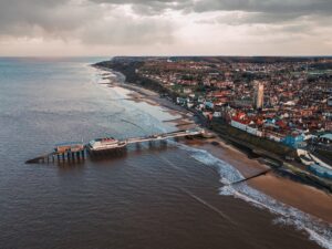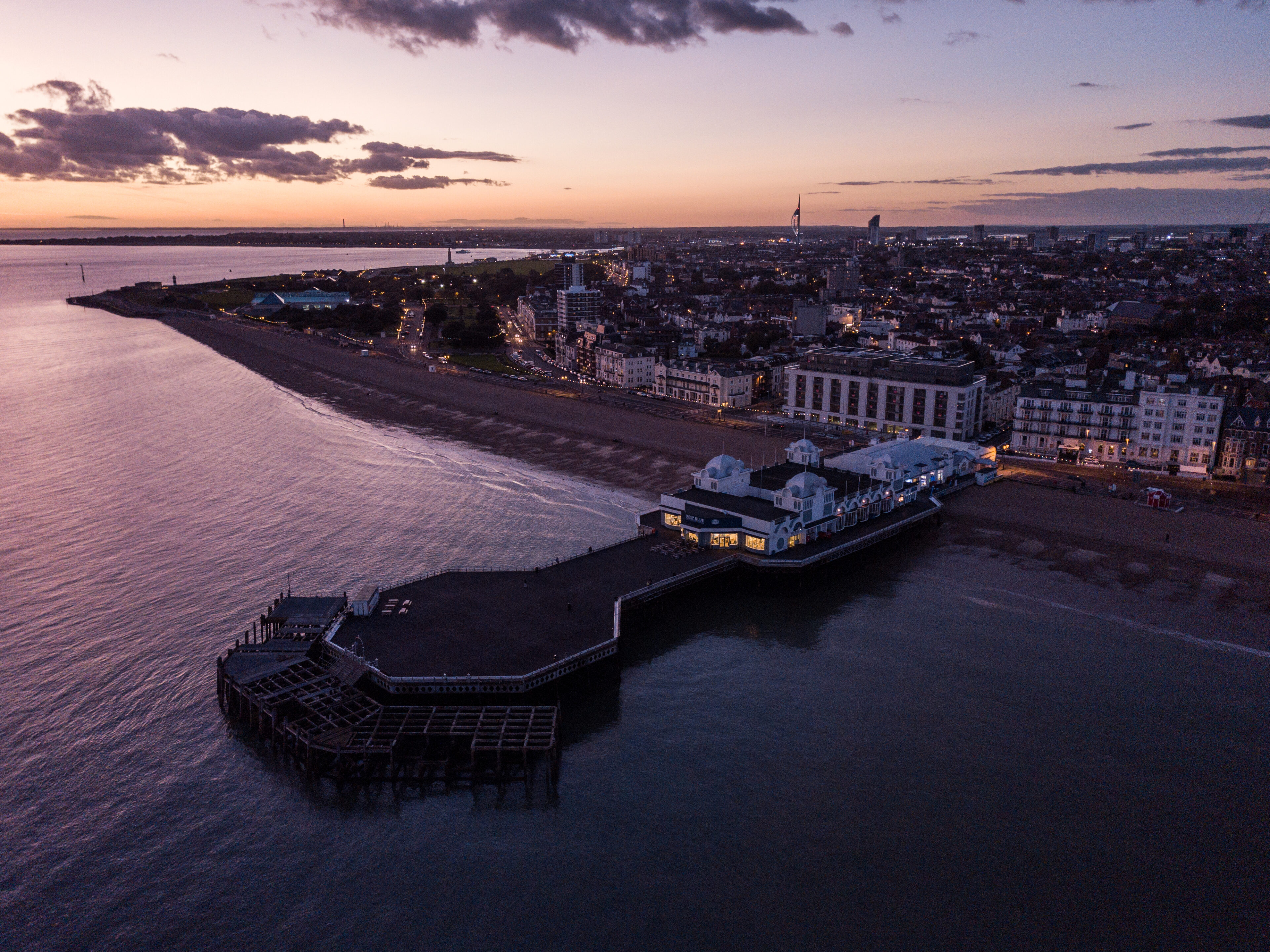 | Bird-eye shot of the city, the public beach and the pier on a gloomy day | A bird-eye shot of the city, the public beach and the pier on a gloomy day | |