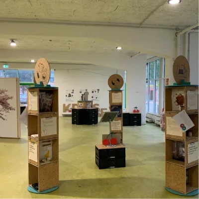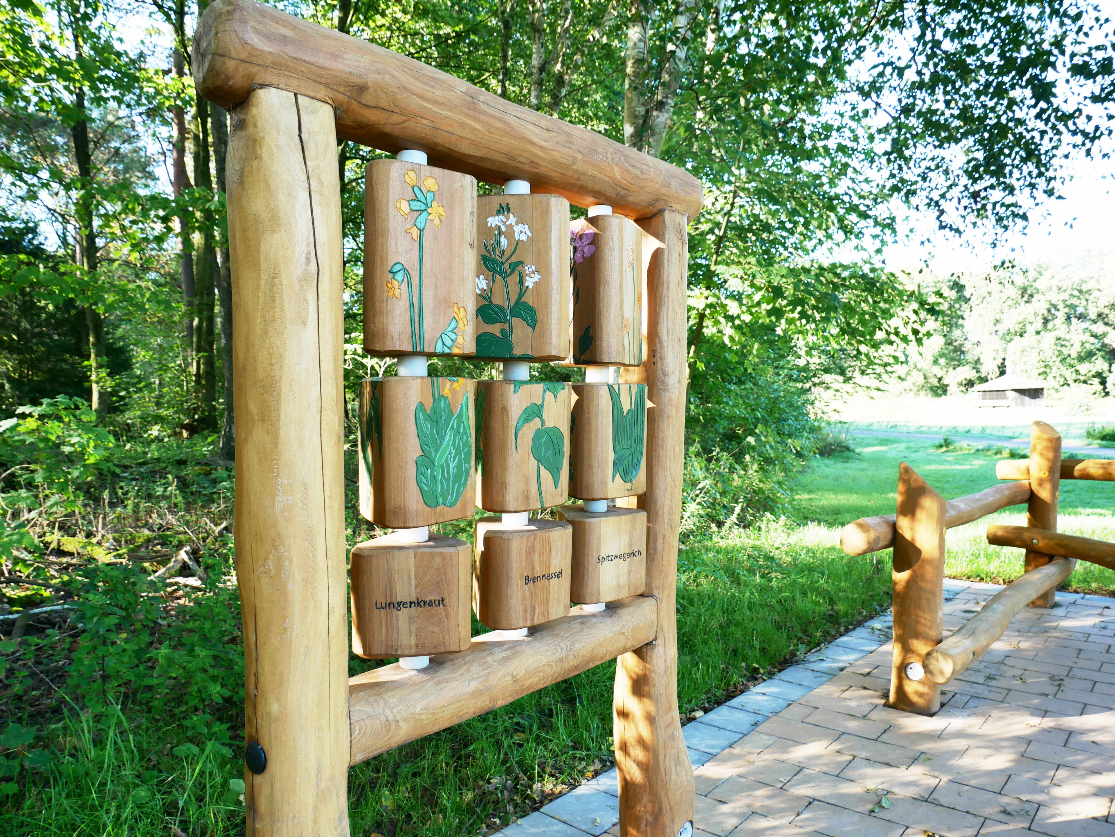 | Waldkompetenzzentrum Heidhof Bottrop | Quelle: OLFF APPOLDwww.olffappold.com, Ruhr Tourismus GmbH · Lizenz: CC-BY-SA | Waldkompetenzzentrum Heidhof Bottrop: Holzrahmen mit vier drehbaren Elementen zeigt Zeichnungen von Pflanzen im Wald, umgeben von Bäumen. |