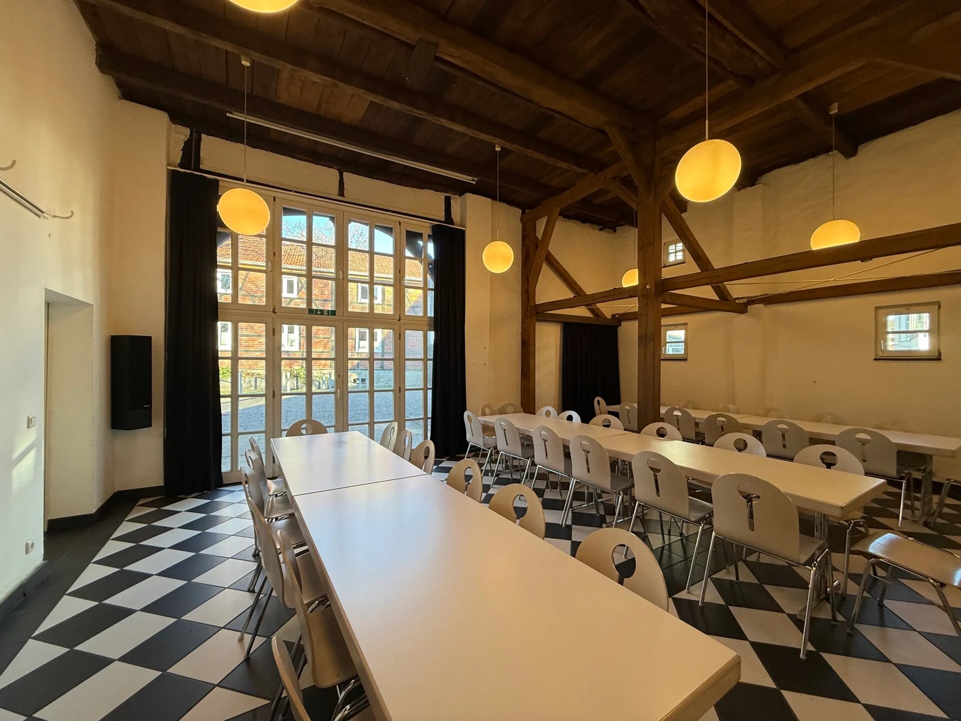 | Waldkompetenzzentrum Heidhof Bottrop | Quelle: OLFF APPOLDwww.olffappold.com, Ruhr Tourismus GmbH · Lizenz: CC-BY-SA | Waldkompetenzzentrum Heidhof Bottrop: Innenansicht eines Ziegelsteinraums mit hölzerner Dachkonstruktion und Info-Tafel an der Wand. |