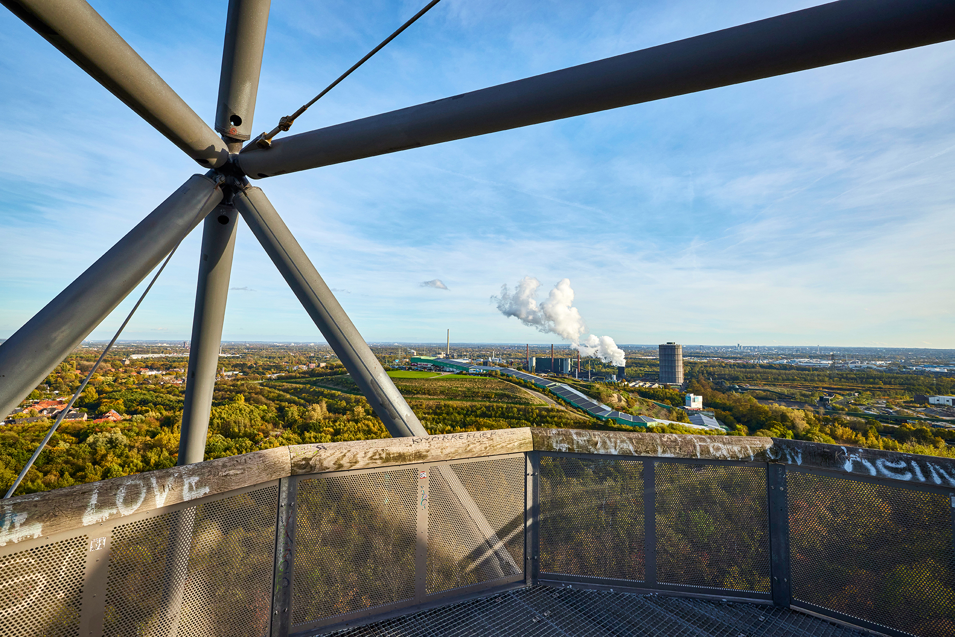 | Tetraeder Halde Beckstr. Bottrop | Quelle: OLFF APPOLDwww.olffappold.com, Ruhr Tourismus GmbH · Lizenz: CC-BY-SA | Tetraeder Halde Beckstr. Bottrop: Die Aussicht auf Bottrop aus dem Tetraeder mit weiten Feldern und einer stählernen Plattform. |