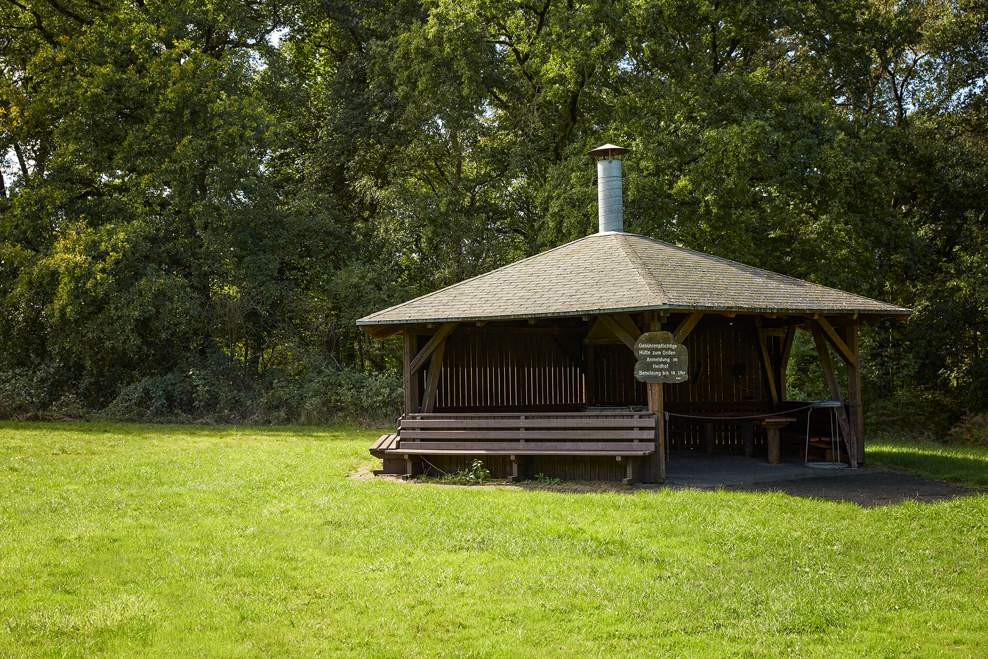 | Waldkompetenzzentrum Heidhof Bottrop | Quelle: OLFF APPOLD, Ruhr Tourismus GmbH · Lizenz: CC-BY-SA | Waldkompetenzzentrum Heidhof Bottrop: <p>Holzüberdachte Picknickhütte im Grünen mit Bänken, umgeben von Bäumen in Bottrop.</p> |