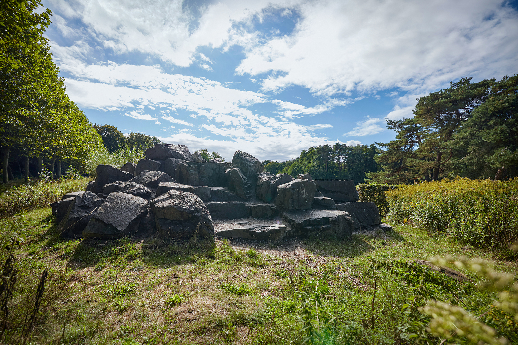 <p>Große dunkle Steine bilden einen natürlichen Felsenhügel unter einem blau-weißen Himmel.</p>
