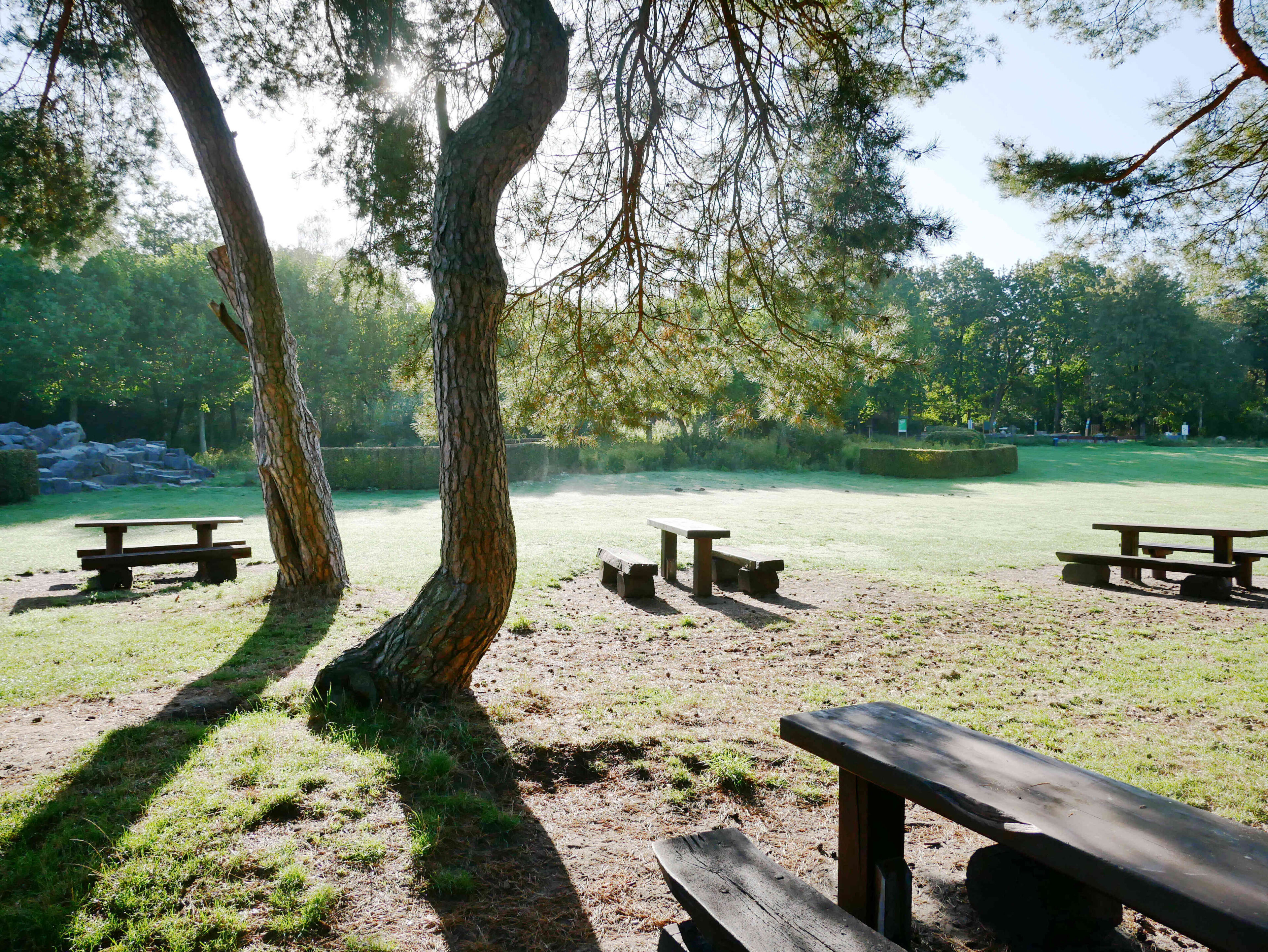 | Waldkompetenzzentrum Heidhof, Bottrop, Bänke | Quelle: Kreis Recklinghausen · Lizenz: CC-BY-SA | Waldkompetenzzentrum Heidhof, Bottrop, Bänke: Holzbänke unter hohen Bäumen auf einer Wiese am Heidhof in Bottrop bei sonnigem Morgenlicht |