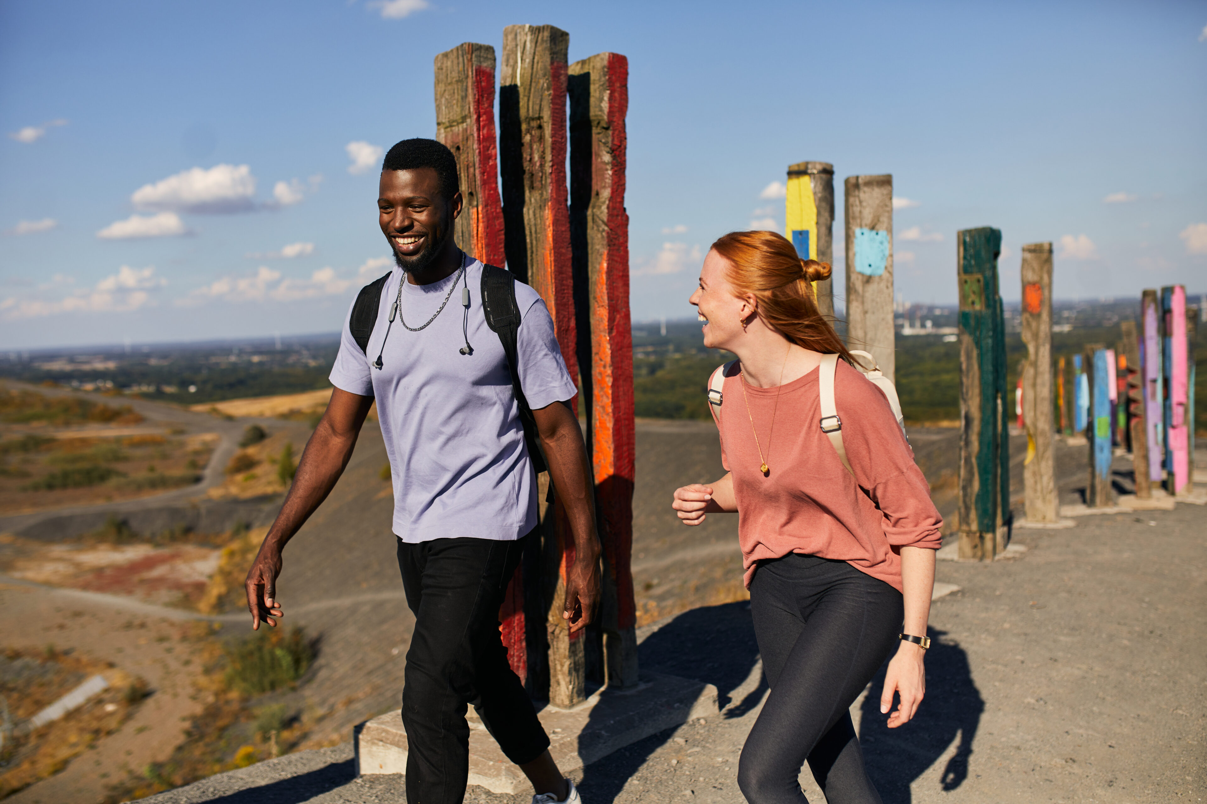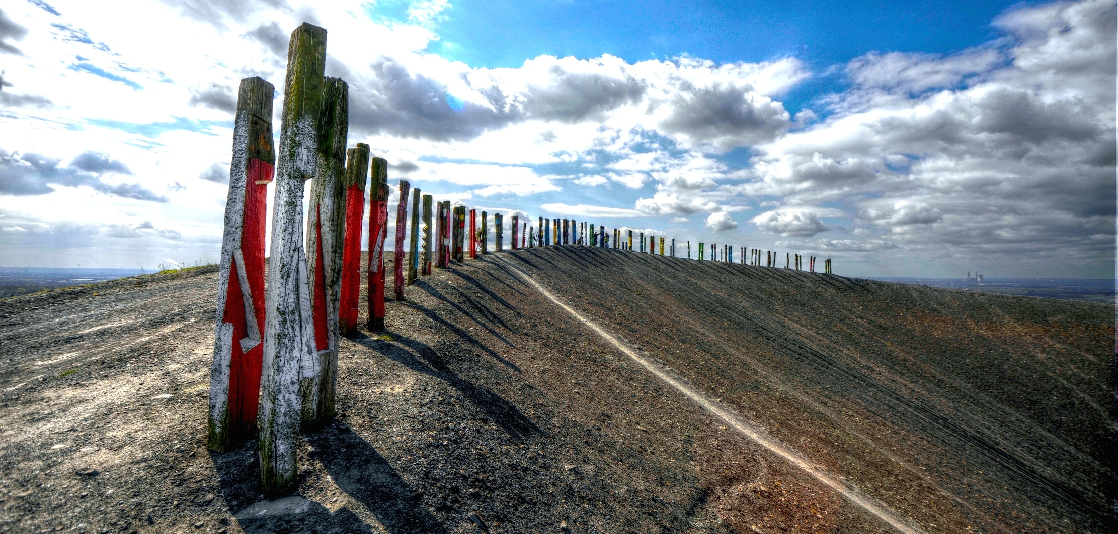 Auf dem Gipfel erwartet dich eine eindrucksvolle Verbindung von Kunst und Industriekultur: Die „Totems“ – bunt gestaltete Bahnschwellen aus dem Bergbau – setzen einen markanten Akzent in der Landschaft und machen die Halde zu einem besonderen Kunstort unter freiem Himmel.